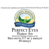 Перфект Айз НСП – это уникальное сочетание питательных компонентов, предназначенных для улучшения зрения. Он содержит комплекс антиоксидантов, таких как в-каротин, витамины А и Е, цинк, селен, глутатион, таурин, лютеин, предотвращающих разрушительное действие свободных радикалов. Это новая, улучшенная формула, в которой значительно увеличены дозы витамина А и в-каротина, а также добавлен еще один важный для зрения каротиноид – лютеин. Компоненты, входящие в состав БАД, обеспечивают специфическую защиту хрусталику, роговице и сетчатке, а также восстанавливают микроциркуляцию.
